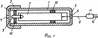 Плата 7 внутри корпуса зафиксирована центрирующими вкладышами 10, а выводящий провод 8 микросхемы платы выведен в отверстие 6 заднего торца, свободный конец провода 8 снабжен вилкой 11 с плоскими контактами 12.
