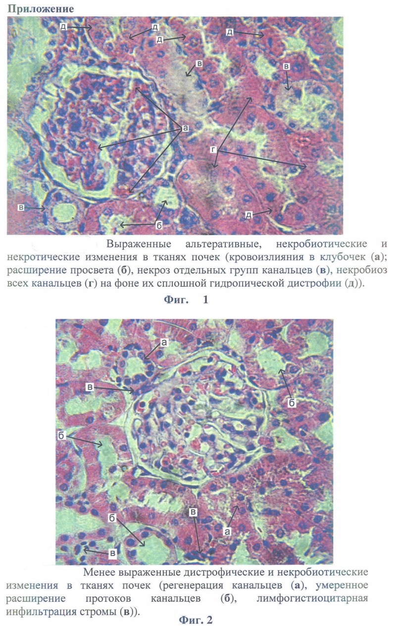 Сущность способа подтверждается морфологически, где на Фиг.1 в опытной группе выявлены выраженные альтеративные, некробиотические и некротические изменения в тканях почек, отмечались: кровоизлияния в клубочек (а); расширение просвета канальцев (б), некроз отдельных групп канальцев (в), некробиоз всех канальцев (г) на фоне их сплошной гидропической дистрофии (д). В клубочках выявлены выраженный оттек, дистрофические изменения, имеются мелкоочаговые кровоизлияния в строму. На Фиг.2 при гистологическом исследовании почек в группе 2 выявлены менее выраженные дистрофические и некробиотические изменения в тканях почек: регенерация канальцев (а), умеренное расширение протоков канальцев (б), лимфогистиоцитарная инфильтрация стромы (в), которая является показателем регенераторного процесса.