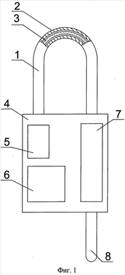 Электронная пломба (фиг.1) состоит из корпуса 4, троса 1, блока контроля 5 целостности троса 1, средства хранения пломбировочной информации и обмена данными 6 с переносным и/или стационарным считывающим устройством (на фиг. не показан). Трос 1 состоит из внешней оболочки 2 и внутренней жилы 3, при этом один конец его жестко зафиксирован в корпусе 4, соединен с блоком контроля целостности троса 1, а другой, рабочий конец 8 троса, после установки на запираемом объекте, фиксируется запорным механизмом 7, расположенным в корпусе 4.