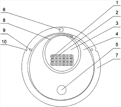На чертеже представлена конструкция оптического кабеля. Она содержит оптические волокна 1 в полимерных лентах 2, гидрофобный заполнитель 3, закрывающий одну из вершин другой вершиной с перекрытием С-формы модуль 4, главный армирующий элемент 5 в этом модуле, дополнительный силовой элемент 6 во внешнем полимерном покрытии 7, водоблокирующую ленту, расположенную по всей длине внутреннего сечения С-формы модуля с перекрытием краев, два разрывающих внешнюю оболочку корда 9, расположенных симметрично относительно друг друга ближе к вершинам С-формы модуля, и две борозды 10, обозначающие местоположение двух разрывающих внешнюю оболочку кордов.