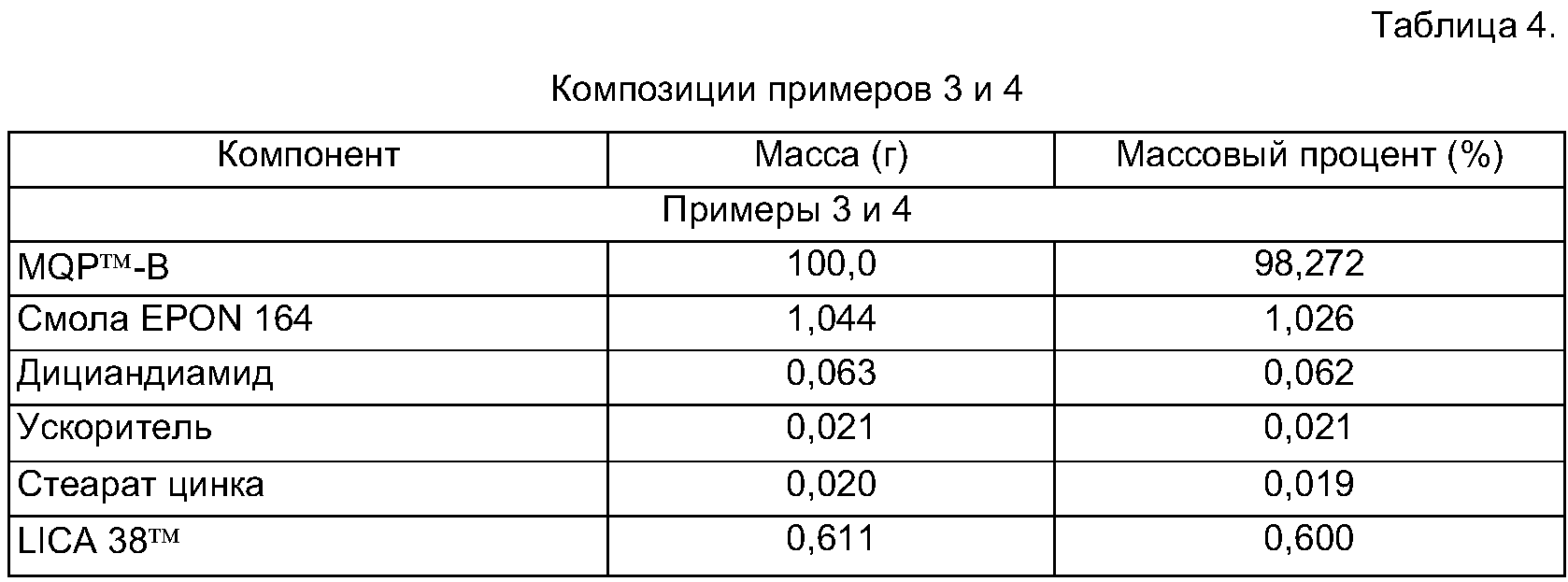 Коммерчески доступный порошок MQP -B смешивают с органотитанатом LICA 38 (Kenrich Petrochemicals, Inc.), эпихлоргидрин/крезольной эпоксиноволачной смолой EPON 164 (Shell Chemical Company), дициандиамидным отверждающим агентом (SKW Trostberg), ускорителем на основе третичного амина, Fenuron , (SKW Trostberg), стеаратом цинка и органоглиной Cloisite 30В (Продукты Southern Clay) в виде 8%-го раствора в ацетоне. Смолу, отверждающий агент, ускоритель, стеарат цинка, органотитанат и органоглину добавляют вместе с ацетоном в стеклянный 500 мл химический стакан. Смесь периодически перемешивают с получением гомогенного раствора органических компонентов. Впоследствии к этому раствору добавляют порошок MQP -В, давая возможность для добавления дополнительного количества ацетона, достаточного для погружения порошков в раствор (см. таблицу 8 для композиций). Затем химический стакан, содержащий эту смесь, помещают на нагреваемый столик и нагревают при 50°С. Содержимое периодически перемешивают, в то время как ацетон испаряется. Для полной сушки порошок удаляют из химического стакана и равномерно распределяют на плоской поверхности в вытяжном шкафу.