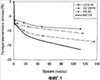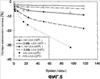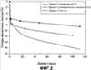 Коммерчески доступный порошок MQP -B предварительно обрабатывают в 0,5%-ом водном растворе аминосилана SIA0610 (Gelest). Порошок перемешивают в течение 10 минут, а затем его помещают в печь при 110°С на 30 минут, с последующей сушкой в вытяжном шкафу в течение 24 часов. Приготавливают 8%-ый раствор эпихлоргидрин/крезольной эпоксиноволачной смолы EPON 164 (Shell Chemical Company), дициандиамидного отверждающего агента (SKW Trostberg), ускорителя на основе третичного амина, Fenuron , (SKW Trostberg) и стеарата цинка в ацетоне в стеклянном 500 мл химическом стакане. Периодически осуществляют перемешивание смеси с получением гомогенного раствора органических компонентов. Впоследствии сухие порошки с силановым покрытием добавляют к ацетоновому раствору, давая возможность для добавления дополнительного количества ацетона, достаточного для погружения порошков в раствор. Общие пропорции и композиции компонентов представлены в таблице 7. Затем химический стакан, содержащий эту смесь, помещают на нагреваемый столик и нагревают при 50°С. Содержимое периодически перемешивают, в то время как ацетон испаряется. Для полной сушки порошок удаляют из химического стакана и равномерно распределяют на плоской поверхности в вытяжном шкафу. Фиг. 6 показывает сравнение потерь магнитного потока в результате старения необработанного (без связующего агента) MQP -B и MQP -B с покрытием из SIA0610, которые были подвергнуты способу нанесения жидкого покрытия.