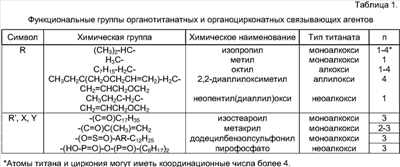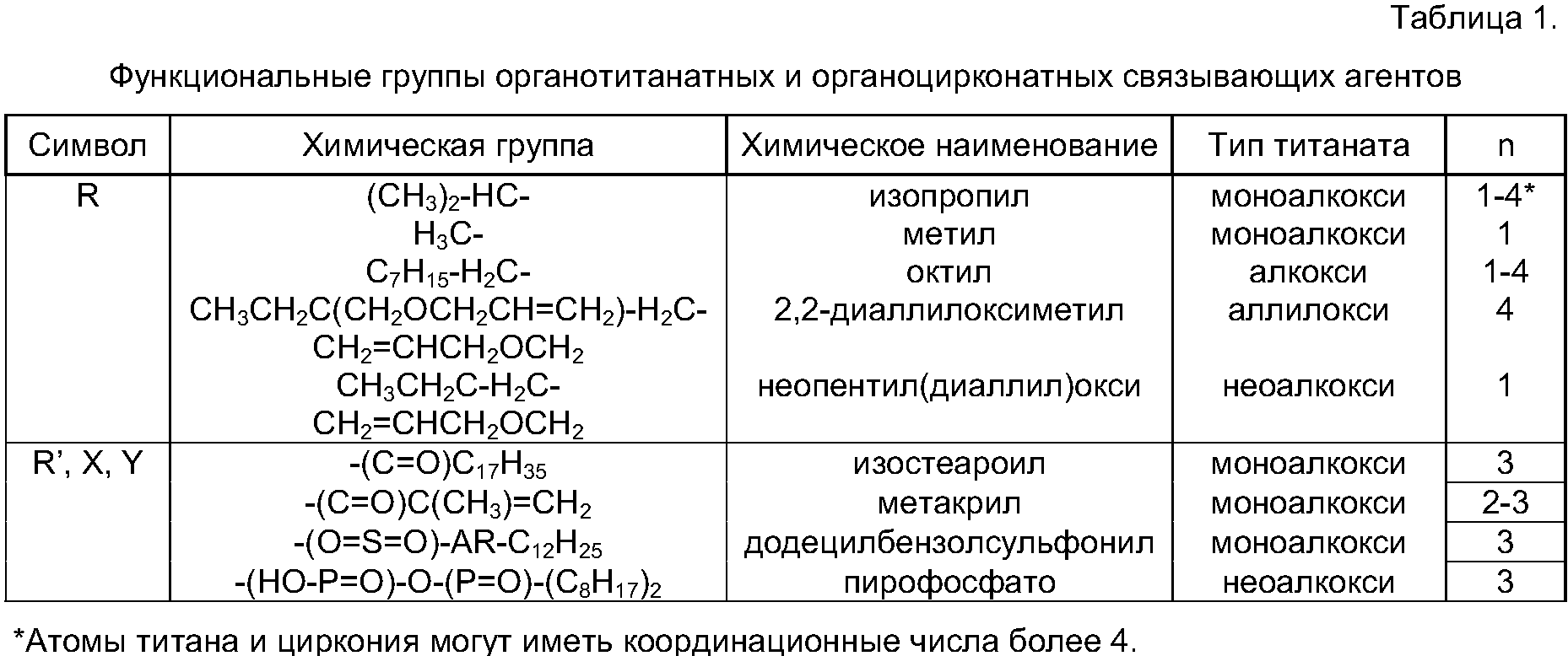RO представляет собой гидролизуемую группу, которая реагирует с поверхностными протонами или гидроксильными группами, где R может представлять собой алкилы с короткой или длинной цепью (моноалкокси) или ненасыщенные аллилы (неоалкокси). Ti и Zr, как правило, представляют собой четырехвалентные атомы титана и циркония соответственно, причем оба они могут иметь также более высокую или более низкую валентность. X представляет собой связующие функциональные группы, такие как фосфато, фосфито, пирофосфато, сульфонил, карбоксил и тому подобное. R’ представляет собой термопластичную функциональную группу, такую как: алифатическая и неполярная изопропильная, бутильная, октильная, изостеароильная группы; нафтеновую и умеренно полярную додецилбензильную группы; или ароматические бензильные, кумильные, фенильные группы. Y представляет собой термореактивную функциональную группу, которая, как правило, является реакционно-способной, например амино или винильную группу. n представляет собой функциональность молекулы. Функциональность n=2 подразумевает, что имеются две реакционно-способные гидролизуемые группы и две органические функциональные группы для совместимости с полимерным связующим. Примеры различных функциональных групп и функциональностей этих связывающих агентов показаны в таблице 1. Органотитанаты и органоцирконаты жидких связывающих агентов с пирофосфато и фосфито связующими функциональными группами, как было обнаружено, являются наиболее эффективными по стойкости к окислению благодаря их реакционно-способной природе по отношению к поверхностным протонам и гидроксилам, присутствующим на поверхностях магнитных порошков.