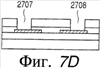 (d) Пленку покрывают фоторезистом и паттерн для электрода стока формируют через отверстие 2707, а для электрода истока – через отверстие 2708. Затем пленки 2705, 2706, изолирующие затвор, вытравливают через отверстия 2707, 2708.
