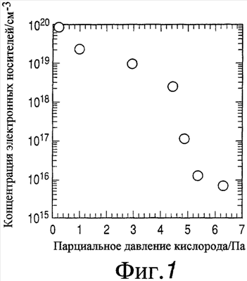 Фиг.1 представляет собой диаграмму, показывающую связь между концентрацией электронных носителей в аморфном оксиде In-Ga-Zn-O типа, сформированном в процессе осаждения импульсным лазерным осаждением при парциальном давлении кислорода во время формирования пленки.
