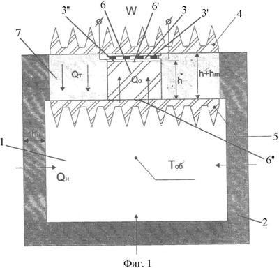 Пусть электрическая мощность, подаваемая на термоэлектрический модуль 3 постоянна, а все габариты термоэлектрического устройства, за исключением высоты теплопровода 6, и свойства материалов известны. Рассматриваемая термоэлектрическая система находится в состоянии термодинамического равновесия. В этом случае тепло, откачиваемое термоэлектрическим устройством, компенсируется теплонатеканиями, поступающими в охлаждаемый объем 1. Эти теплонатекания необходимо разделить на две составляющие:
