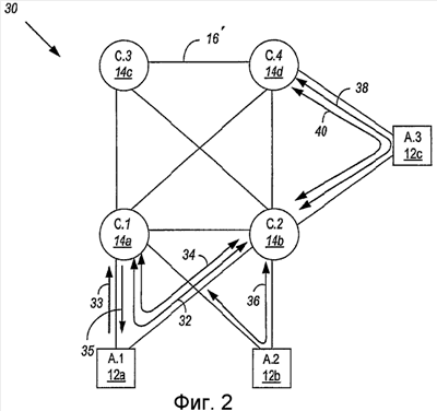 На Фиг.2 описан способ по одному варианту осуществления настоящего изобретения со ссылкой на сеть 30, которая иллюстрирует пример выборочного разрешения определенным видам потоков трафика, соединений или вызовов проходить через узлы с ограничением транзита, так же как выборочного разрешения потоков трафика, соединений или вызовов, принадлежащих определенным Виртуальным Магистральным Сетям (“VBN”). Специалисты в данной области техники должны понять, что настоящее изобретение можно адаптировать к применению к любому идентифицируемому виду или совокупности потоков трафика, соединению или вызову. Для примера, сеть 30 может являться сетью с маршрутизацией от источника, действующей по протоколу PNNI. Сеть 30 имеет три границы или сетевых узла 12a, 12b и 12c доступа, которые соответственно обозначены как A.1, A.2 и A.3. Кроме того, основные сетевые узлы 14a, 14b, 14c и 14d, дополнительно соответственно обозначенные как C.1, C.2, C.3 и С.4, соединены каналами 16′ связи друг с другом и с одним или более сетевыми узлами (A.1, A.2 и A.3) доступа известным в данной области техники способом. Все сетевые узлы (A.1, A.2 и A.3) являются узлами с ограничением транзита в смысле, определенном ранее для иллюстрации.