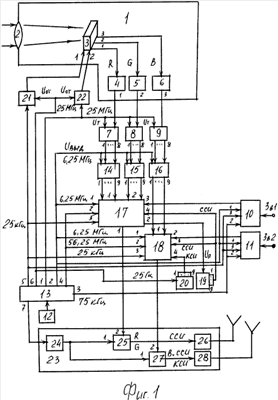 Фотоэлектрический преобразователь 1 матрицей ПЗИ 3 формирует три аналоговых видеосигнала основных цветов R, G, В. Объектив 2 создает изображение в фокальной плоскости, в которой расположена фоточувствительная сторона матрицы ПЗИ 3, оптическое разрешение которой не менее 2000×1000. Матрица ПЗИ выполнена трехслойной по технологии ХЗ. В первом периоде кадра “40 мс” на каждый из трех слоев матрицы ПЗИ /вход 1/ с ключа 21 поступают импульсы 25 кГц частоты строк для считывания сигналов пикселов по вертикали, на второй вход матрицы ПЗИ с ключа 22 поступают импульсы 25 МГц для считывания сигналов R, G, В пикселов по горизонтали [4, с.832]. Аналоговые сигналы с матрицы ПЗИ 3 поступают на входы предварительных усилителей 4 /R/, 5 /G/, /6 /В/, с выходов которых поступают на входы АЦП соответственно 7, 8, 9, с выходов которых 8-разрядные коды цветовых сигналов с дискретизацией 25 МГц поступают на входы своих кодеров 14, 15, 16. Синхронизация считывания сигналов с матрицы ПЗИ выполняется сигналом частоты кадров 25 Гц открытием ключей 21, 22 на длительность кадра 40 мс. Синтезатор 13 частот выдает с первого выхода импульсы 25 МГц дискретизации кодов в АЦП видеосигналов, со второго – импульсы 6,25 МГц выдачи кодов из кодеров 14-16, с третьего – импульсы 75 кГц дискретизации сигнала звука, с четвертого – тактовые импульсы 56,25 МГц для формирователей 17, 18 кодов, с пятого – импульсы 25 кГц частоты отрок на первый вход матрицы ПЗИ 3 и блоки 17, 18, с шестого выхода – импульсы 25 Гц частоты кадров для открытия ключей 21, 22 длительностью, равной длительности кадра 40 мс, с седьмого – синусоидальные колебания несущей частоты 843,75 МГц в передатчик 23 со стабильностью 10-7. Задающий генератор 12 генерирует синусоидальные колебания со стабильностью 10-7. АЦП 7, 8, 9 преобразуют аналоговые видеосигналы R, G, В в 8-разрядные коды, поступающие в кодеры 14, 15, 16.