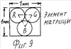 1, 2, 3 – 255 – последовательное следование излучений в периоде кадра. Следование импульсов излучений в кадре через соответствующие равные интервалы времени создают естественные условия для восприятия зрением человека яркости изображения и достоверности цветопередачи. Инерционность срабатывания принимается до I мкс. По окончании накопления кодов кадра блоками 45, 50, 55 все коды R, G, В синхронно выдаются в блоки 46, 51, 56, где они преобразуются в число подач напряжения питания на светодиоды СД-экрана 67. Современные технологии позволяют выполнить каждый из блоков 45, 55, 50, 46, 51, 56 одной микросхемой. Блок 41 выделения СИС включает /фиг.7/ первый 82, второй 83, третий 84 счетчики импульсов, счетные входы которых являются первым – третьим входами блока 41, первый 85 и второй 86 элементы И, первый 87, второй 88, третий 89 элементы НЕ и диод. Выходы первого и второго счетчиков импульсов 82, 83 подключены к входам элемента И 85, выход которого и выход третьего счетчика импульсов 84 подключены к входам второго элемента И 86, выход которого является выходом блока 41. Входы элементов НЕ подключены к счетным входам первого-третьего счетчиков 82, 83, 84 импульсов, выходы элементов НЕ и выход элемента И 86 через диод объединены и подключены параллельно к управляющим входам счетчиков импульсов 82, 83, 84. Плоскопанельный светодиодный экран 67 представляет совокупность излучающих элементов в матрице по числу разрешения кадра 960000, которые выполняются в стекле СД-экрана. СД-экран включает экранное стекло и матрицу из излучающих элементов по числу разрешения кадра /1200×800/960000 пикселов. Каждый излучающий элемент включает /фиг.9/ три светодиодных ячейки /СД-ячейки/, каждая из которых излучает один из основных цветов R, G, B. СД-ячейка содержит /фиг.8/ светодиод 90 белого свечения и соответствующие цветной светофильтр 91 на излучающий стороне. Три СД-ячейки составляют излучающий элемент /фиг.9/, расположение которых в СД-экране на фиг.10. Уровень яркости излучения СД-ячейки пропорционален числу импульсов излучений светодиода за период кадра, которых может быть от 1 до 255, занимающих от 78 мкс до 20 мс. Суммарное излучение трех основных цветов тремя СД-ячейками формирует яркость и цветовой тон одного пиксела экрана. В качестве светодиодов могут быть применены сверхъяркие светодиоды типа производимых фирмами “Nichia”, «Ledtronics», «Kingbright» [4 с47], но диаметром до 0,5 мм /фиг.8/, а лучше светодиоды, разрабатываемые по технологии PLЕД, использующей светодиоды с полимерными органическими молекулами [5 с.43]. Светодиоды исполняются в стекле /или в пленке/ методом микроэлектронной технологии. При размере одного излучающего элемента 1×1 мм /фиг.9/ размеры СД-экрана составляют: по горизонтали 1200×1 мм = 1200 мм, по вертикали 800×1 мм = 800 мм, по диагонали 1442 мм или 56,7 дюймов. Фотоэлектрический преобразователь 3 матрицами ПЗИ 4 и 5 формирует три аналоговых цветовых сигнала правого изображения и три аналоговых цветовых сигнала левого изображения. В первом периоде кадра /50 Гц/ импульсы 24 МГц считывания сигналов R, G, В пикселов по горизонтали [3 с.832] поступают с ключа 24 на второй вход матрицы ПЗИ 4 и 40 кГц с ключа 26 на первый вход матрицы ПЗИ 4 для считывания сигналов по вертикали. Аналоговые видеосигналы с первого-третьего выходов матрицы ПЗИ 4 поступают на первые входы предварительных усилителей 6, 7, 8. При втором кадре импульсы 24 МГц и 40 кГц 