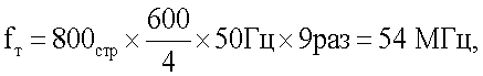Частота строк fс=800×50 Гц=40 кГц. Наименьший коэффициент сжатия потока кодов кадра принимается 4. Частота дискретизации кодов в сжатом потоке 6 МГц Тактовая частота при последовательном следовании кодов в последовательном виде в сжатом потоке: