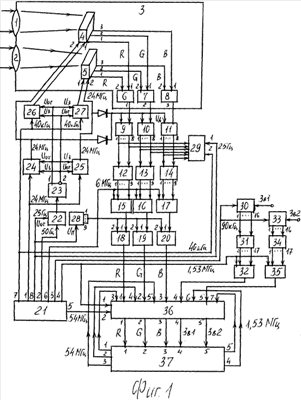 Видеокамера включает /фиг.1/ первый /правый/ объектив 1, второй /левый/ объектив 2, фотоэлектрический преобразователь 3 /ФЭП/, являющийся датчиком видеосигналов в двух изображениях одного пространства и формирующий три видеосигнала правого кадра RП, GП, ВП и три видеосигнала левого кадра RЛ, GЛ, ВЛ, и содержит первую матрицу ПЗИ 4, фоточувствительная сторона которой расположена в фокальной плоскости первого объектива 1, вторую матрицу 5, фоточувствительная сторона которой расположена в фокальной плоскости второго объектива 2. Матрица ПЗИ – прибор с зарядовой инжекцией по технологии Foreon Х3 из трехслойного КМОП-датчика [2 с.552] и [3 с.832, 833, 835] с соответствующим оптическим разрешением /не менее 800×600/, первый, второй и третий выходы матрицы ПЗИ 4 подключены к первым входам предварительных усилителей 6, 7, 8, первый – третий выходы матрицы ПЗИ 5 подключены к вторым входам предварительных усилителей 6, 7, 8, выходы которых являются первым – третьим выходами ФЭП. Видеокамера включает первый 9, второй 10, третий 11 АЦП видеосигнала R, G, В, выполненные идентично АЦП в прототипе [1 с.4, 5, фиг.5], первый 12, второй 13, третий 14 кодеры, выполненные идентично кодерам в прототипе [1 с.5, фиг.10], первый 15, второй 16, третий 17 блоки элементов И, также выполненные идентично этим же блокам в прототипе [1 с.22, фиг.9], выходы которых подключены к первым входам соответственно 18, 19, 20 элементов ИЛИ, синтезатор 21 частот, последовательно соединенные первый ключ 22 и триггер 23, второй ключ 24, третий ключ 25, введенные четвертый ключ 26 и пятый ключ 27 и самоходный распределитель 28 импульсов /СРИ/, выход которого подключен параллельно к вторым входам элементов ИЛИ 18, 19, 20, включает видеоискатель 29, последовательно соединенные первый АЦП 30 сигнала звука, первый кодер 31 сигнала звука и первый блок 32 элементов И сигнала звука, последовательно соединенные второй АЦП 33 сигнала звука, второй кодер 34 сигнала звука и второй блок 35 элементов И сигнала звука, накопитель 36 цифровой информации и устройство 37 воспроизведения. Самоходный распределитель 28 импульсов имеет девять разрядов, выходы которых объединены, объединенный выход подключен параллельно к вторым входам элементов ИЛИ 18, 19, 20. При поступлении на вход самоходного распределителя 28 импульсов /СРИ/ пускового импульса 25 Гц он выдает код из девяти единиц 111111111, являющийся синхроимпульсом стереопар СИС. Три кода СИС синхронно поступают на первый – третий входы блока 36 и являются первым кодом в каждой стереопаре. Устройство 37 воспроизведения /фиг.2/ содержит синтезатор 38 частот, шестой 39 и седьмой 40 ключи, вновь введенный блок 41 выделения синхроимпульса стереопар СИС, канал сигнала R, включающий первый ключ 42 и последовательно соединенные первый декодер 43, первый блок 44 обработки кодов, первый накопитель 45 кодов кадра и первый формирователь 46 управляющих сигналов, канал сигнала G, включающий второй ключ 47 и последовательно соединенные второй декодер 48, второй блок 49 обработки кодов, второй накопитель 50 кодов кадра и второй формирователь 51 управляющих сигналов, канал сигнала В, включающий третий ключ 52, и последовательно соединенные третий декодер 53, третий блок 54 обработки кодов, третий накопитель 55 кодов кадра и третий формирователь 56 управляющих сигналов, содержит первый канал звука, включающий четвертый ключ 57, последовательно соединенные декоде