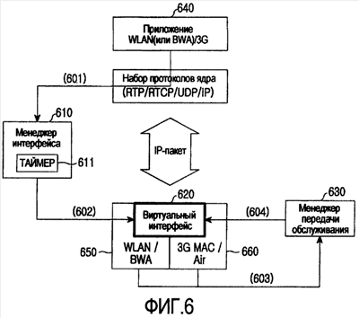 Прикладная программа уровня 640 приложения, которая одновременно использует сеть WLAN/BWA и сеть мобильной связи, на этапе 601 передает запрос на настройку соединения в менеджер 610 интерфейса. Далее менеджер 610 интерфейса классифицирует прикладную программу, поддерживающую технологию множественного беспроводного доступа, посредством номера порта. Далее на этапе 602 менеджер 610 интерфейса обменивается потоками обмена прикладной программы с внешней средой посредством виртуального интерфейса 620. Виртуальный интерфейс 620 действует как интерфейс, который виртуально существует в сети WLAN/BWA и сети мобильной связи, посредством чего возможно скрыть от верхнего уровня изменение в нижнем физическом уровне, то есть уровне 650 WLAN/BWA и уровне 660 3G MAC/Air. На этапе 603 физические уровни 650 и 660 передают информацию состояния сетевого интерфейса в менеджер 630 передачи обслуживания. Далее менеджер 630 передачи обслуживания на основании принятой информации состояния сетевого интерфейса определяет, выполнять ли передачу обслуживания. На этапе 604 менеджер 630 передачи обслуживания передает результат решения передачи обслуживания в виртуальный интерфейс 610. Потоки обмена уровня приложения, передаваемые в виртуальный интерфейс, таким образом, передаются во внешнюю среду, используя какой-либо один из интерфейсов для уровня 650 WLAN/BWA и интерфейса для уровня 660 3G MAC/Air.