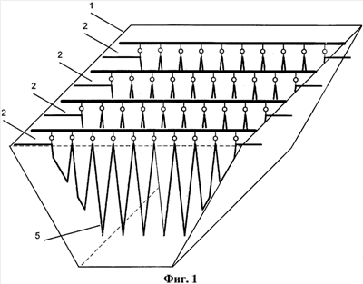 Поэтому в предлагаемой конструкции отрезки металлических прутов 5 соединены между собой последовательно и расположены зигзагообразно. Они равномерно пронизывают весь объем загрузочного бункера 1 за счет того, что расстояния между соседними отрезками металлических прутов 5 не превышают 0,2-0,3 м. Также расстояния от нижних концов отрезков металлических прутов 5 до стенок загрузочного бункера 1 не превышают 0,2-0,3 м. Также расстояния между соседними нагревательными секциями 2 равны между собой и не превышают 0,2-0,3 м. Для того чтобы закрепить отрезки металлических прутов 5 в пространстве, необходимы несущая балка 3 и крепления 6. Крепления 6 содержат изоляторы 7, которые необходимы для изоляции токопроводящих отрезков металлических прутов 5 от несущей балки 3. Такая реализация позволяет получить новое свойство – способность обеспечить равномерный нагрев сыпучего материала.