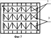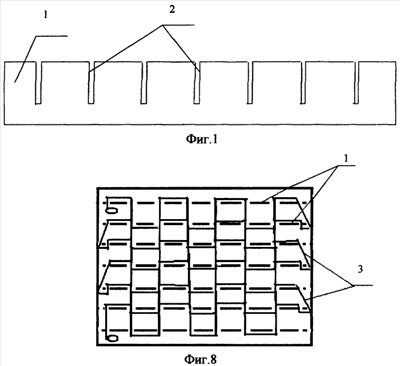 На чертежах полосы каркаса 1 выполнены, например, из термопластичных пластиков, стеклоорганопластика, пластика на бумажной основе, минерального пластика, керамики, а также из металлической проволоки или полосы с электроизоляцией, скрепленные между собой в радиальных направлениях, Фиг.4, 5, 6, или соединенные параллельно друг другу, Фиг.7, 8. В поперечные щелевые пазы 2 уложена гибкая резистивная лента 3 с изменением направления укладки. На Фиг.4, 5, 6 – укладка в виде спирали, с образованием объемной структуры со сквозными каналами трапециевидного поперечного сечения, на Фиг.7 гибкая резистивная лента 3 уложена в поперечные щелевые пазы зигзагообразно с образованием объемной структуры со сквозными каналами треугольного поперечного сечения, на Фиг.8 – со сквозными каналами четырехугольного поперечного сечения,