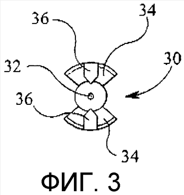 Кроме того, к концам лапок 34, удаленным от основной части 32, прикладывается давление, так чтобы погрузить зажимное средство 36 в элемент 22.