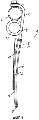 На фиг.1 и 2 зуб 1 изображен в сочетании с несущей частью 2. Несущая часть 2 представляет собой трубу, которая зафиксирована с возможностью вращения, например, на несущем элементе мотовила на радиальном расстоянии от оси вращения мотовила. За счет вращательного движения несущей части 2 можно изменять положение зуба 1 по отношению к почве и, тем самым, культуре. При других применениях зуба несущая часть может иметь и другую форму.