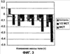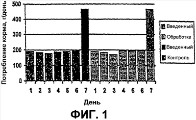 На фиг.1 в сравнительном аспекте представлено потребление корма в течение двух недель собаками, которых кормили кормом, обогащенным МСТ, и кормом, не обогащенным МСТ.