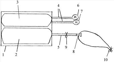 Предлагаемый способ определения проходимости полых органов для жидкости в эксперименте осуществляется следующим образом. При изготовлении устройства (см. чертеж) используют плотный ящик с крышкой 1 размером 30×21×15 см, на дно ящика укладывают кружку Эсмарха 2, поверх нее – манжету 3 от тонометра для измерения артериального давления. Трубки 4 от манжеты тонометра с присоединенными к ним манометром 6 и насосом 7, а также трубку 5 от кружки Эсмарха выводят наружу через отверстия на боковой стенке ящика. Свободный конец трубки 5 герметично соединяют с канюлей 8, имеющей расширение на конце. В качестве измерительного устройства используют манометр 6, мерный цилиндр и секундомер.