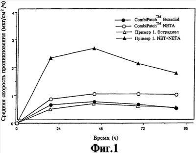 Скорость потока стероида через кожу трупа in vitro из композиции, полученной в примере 1, показана на фиг.1 и обозначена треугольниками ( и ). В качестве примера для сравнения показана скорость потока для коммерческого продукта CombiPatch , который содержит эстрадиол и ацетат норэтиндрона каждый в отдельности (обозначены кружками ( или ). Как показано на фиг.1, скорость потока из смеси норэтиндрона/ацетата норэтиндрона, полученной в примере 1, значительно превышает скорость потока ацетата норэтиндрона из продукта CombiPatch, в то время как скорость потока эстрадиола не изменяется. Скорость потока эстрадиола остается практически постоянной.