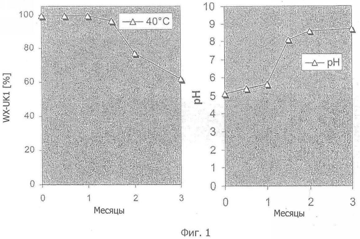 При исследовании стойкости при 2-8°С, 25°С / 60% относительной влажности воздуха и 40°С / 75% относительной влажности воздуха композиция (с) обнаружила при температуре менее 40°С уже через 6 недель около 4%, через 8 недель около 23% и через 12 недель около 38% примесей по сравнению с около 0,5% в начале исследования. Одновременно показатель рН композиции на протяжении 12 недель возрос с 5,1 до 8,7 (фиг.1).