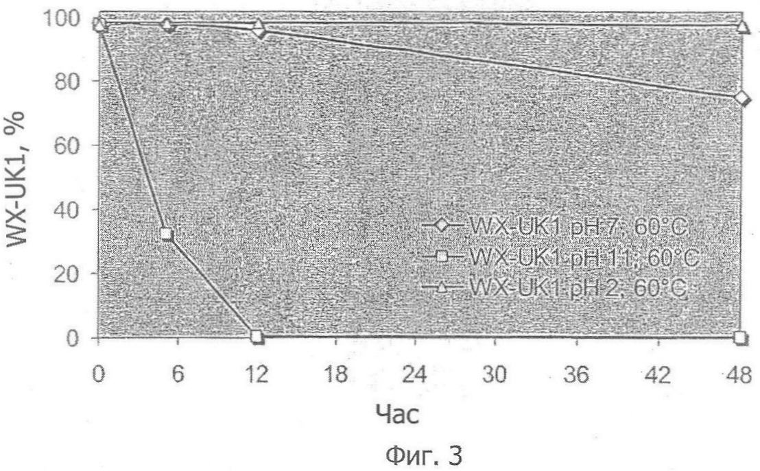 Рост показателя рН вероятно объясняется распадом WX-UK1. На фиг.2 показана возможная реакция распада активного вещества WX-UK1 в водных средах: на первом этапе WX-UK1 распадается с образованием соответствующего амида WX-UK1, причем происходит выделение аммиака, улавливаемого, разумеется, присутствующим WX-UK1 в качестве гидрохлорида в виде хлорида аммония. На втором этапе распада амид WX-UK1 вступает в реакцию со спиртом с выделением дополнительного аммиака и образованием соответствующего сложного эфира WX-UK1. Выделение аммиака вероятно и приводит к увеличению показателя рН.