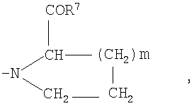 в которой m означает число 1 или 2 и в которой одна или несколько метиленовых групп замещены при необходимости, например, остатком гидроксила, карбоксила, (C1-C4) алкила или аралкила, например, бензила или фенилэтила, причем группа (с) является рацемической D или L-конфигурацией, при этом R7 имеет значение, приведенное для R в пунктах (а), (b) и (f),
