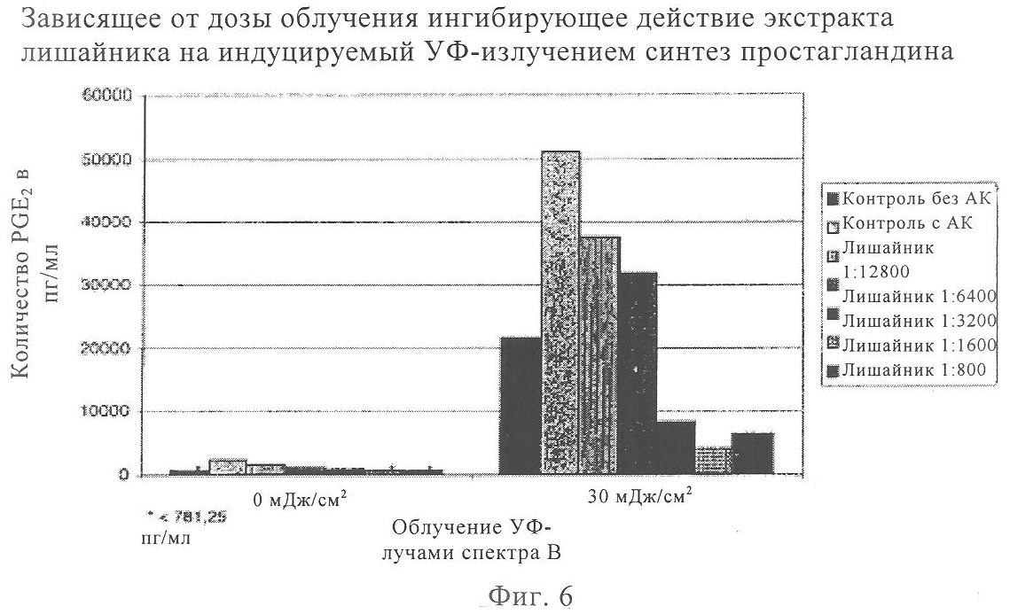 На фиг.6 в графическом виде представлено зависящее от дозы облучения ингибирующее действие экстракта лишайника на индуцируемый ультрафиолетовым излучением синтез простагландина.
