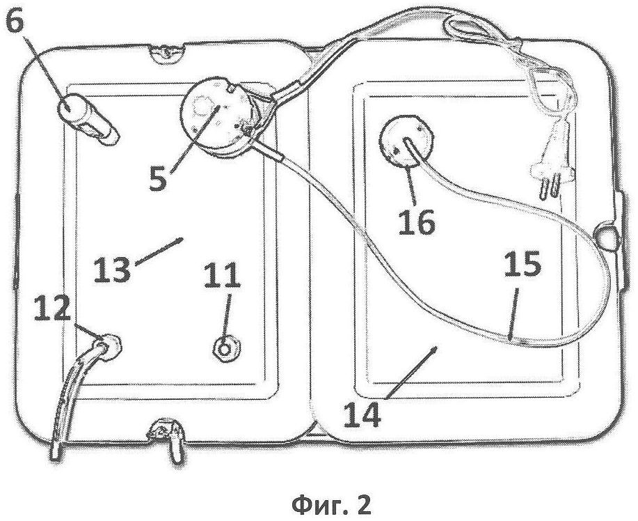 На Фиг.2 показана конструкция водяной бани (вид сверху), где 11 – входная трубка, 12 – выходная трубка, 13 – крышка-2, 14 – крышка-1, 15 – провод питания нагревательного элемента, 16 – нагреватель.