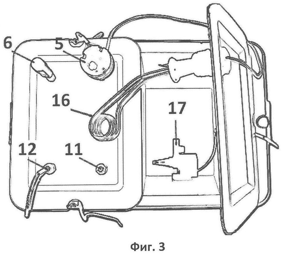 На Фиг.3 показана конструкция водяной бани (внутреннее устройство – вид сверху с приоткрытой крышкой 1), где 17 – электромешалка.