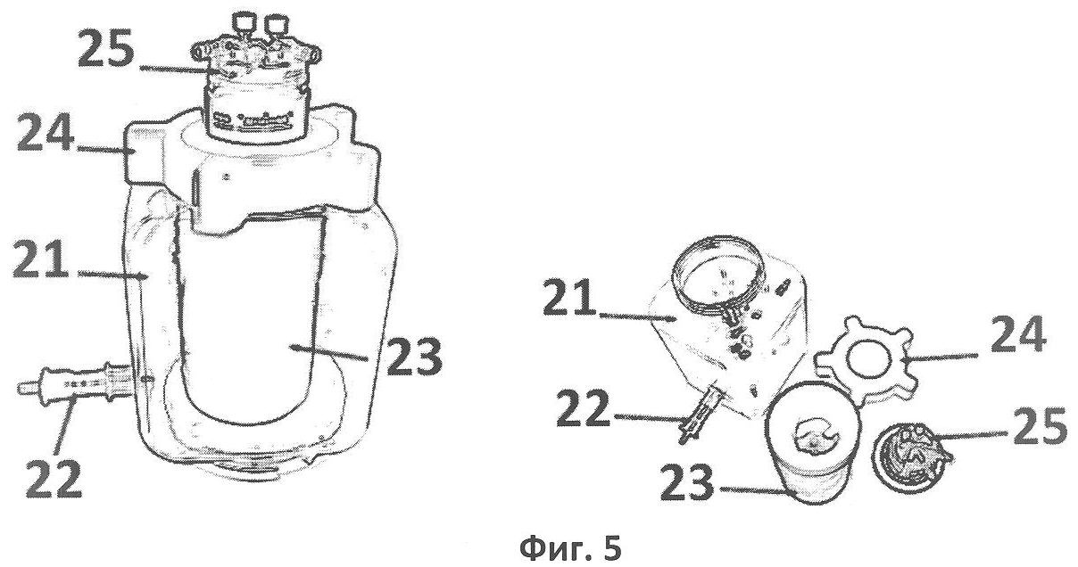 На Фиг.5 показано конструктивное устройство фильтра, где 21 – емкость, 22 – выходное отверстие, 23 – фильтрующий элемент, 24 – крышка, 25 – насадка на фильтрующий элемент с входным отверстием.
