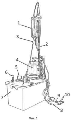 На Фиг.1 показана конструкция устройства, где 1 – емкость, 2 – опорная штанга переменной длины, 3 – зажим, 4 – фильтр, 5 – терморегулятор, 6 – электротермометр, 7 – водяная баня, 8 – эластичная трубка для вставки в кишечную петлю – выходящий поток из кишечной петли, 9 – эластичная трубка для вставки в кишечную петлю – входящий поток в кишечную петлю, 10 – раздувные манжеты.
