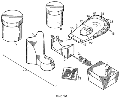 Другим примером является патент США 6119038, относящийся к устройству и способу для ухода за кожей, в котором используется ручной электрический кондиционер кожи/волос, средство для проведения предварительной обработки при щелочном значении pH и средство для основной обработки при кислотном значении pH. Этот ручной кондиционер имеет корпус, содержащий электрическую схему, включающую в себя микропроцессор и аккумуляторную батарею, буквенно-цифровой дисплей, соединенный с микропроцессором, и два наружных электропроводящих электрода широкой зоны действия, соединенных с электрической схемой. Этот блок для ухода содержит также клеммы для зарядки, предназначенные для использования вместе с зарядным устройством. Один из электродов, или электрод, удерживаемый в руке пользователя, приспособлен так, чтобы он имел постоянный контакт с рукой во время использования, а другой электрод, или кожный электрод, приспособлен к приложению электрического тока к коже пользователя. Этот способ включает нанесение на чистую кожу средства для предварительной обработки, прикладывание кожного электрода к щеке, перемещение кожного электрода по обрабатываемому участку кожи при подаче на него положительного и отрицательного тока, промывку обработанной кожи, нанесение на кожу средства для основной обработки и перемещение кожного электрода по обрабатываемому участку кожи.