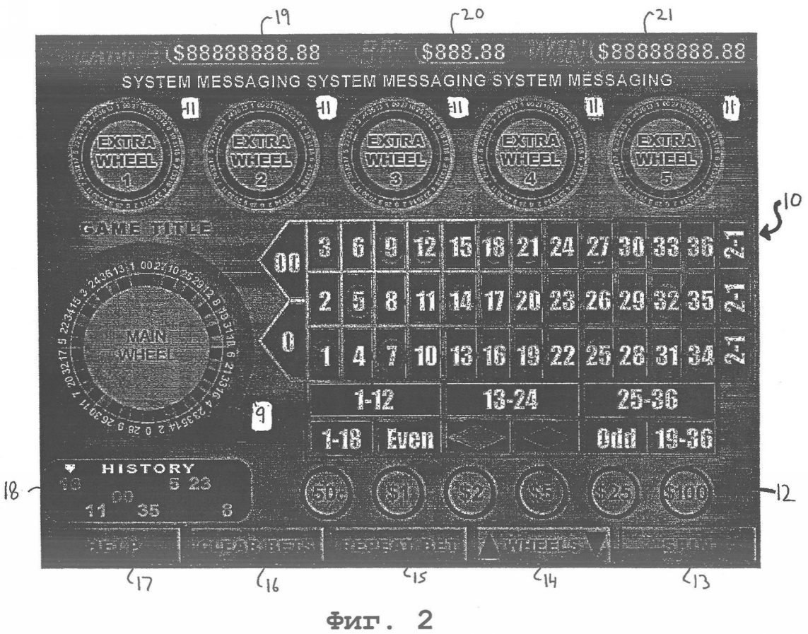 Дисплей включает в себя окно 18 истории, показывающее результаты предыдущего вращения. Он также включает в себя окно 19 “баланс”, окно 20 “ставка” и окно 21 “выигрыш”, позволяющие игроку контролировать свои ставки, и строку 22 сообщений для отображения сообщений, например, от центрального контроллера.