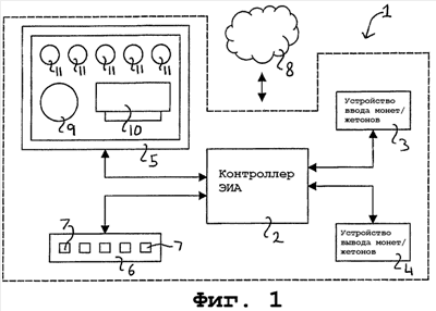 ЭИА 1 может быть автономным аппаратом. Он также может образовывать сеть с другими ЭИА и/или с центром управления через подходящую сеть связи 8, например ЛС и/или ГС, для игры в сетевые (например, интрасетевые или интернетовские) игры, например сетевой джекпот.