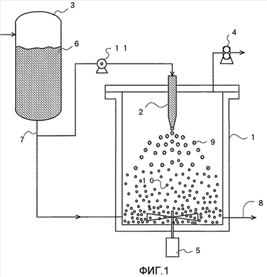 Ссылаясь на фиг.1, конструкция устройства и способ по первому варианту осуществления в соответствии с настоящим изобретением поясняются следующим образом. Подводящий трубопровод 7 для подачи жидкого азота соединен с резервуаром жидкого азота 3, один конец которого соединен через насос 11 с форсункой 2. Различные форсунки с разными диаметрами отверстия подготовлены и могут быть заменены в диапазоне размеров отверстия. Давление внутри форсунки может быть отрегулировано скоростью вращения насоса 11 или устройством для регулирования давления, расположенным с напорной стороны насоса 11 (не показано). Другой конец подводящего трубопровода для подачи жидкого азота соединен с сосудом 1. Вакуумный трубопровод соединен с потолочным трубопроводом сосуда, чтобы понижать давление внутри сосуда вакуумным насосом. Мешалка 5 предусмотрена в нижней части сосуда так, чтобы перемешивать содержимое сосуда. Трубопровод 8 для вывода продукта расположен вблизи низа обечайки сосуда 1.