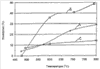 Одну вязаную сетку состава 95%Pt5%Rh использовали для катализа исходного потока 10% NH3 в воздухе, чтобы получить продукт первой ступени, содержащий NOx, N2O, пар, азот, непрореагировавший NH3 и кислород. Продукт первой ступени проходил непосредственно во второй реактор, содержащий каждый из катализаторов второй ступени А, В и С. Оборудование было таким, что температуру над катализатором второй ступени можно было варьировать в интервале от 450°С до 800°С, и композиция выходящего потока могла быть проанализирована на N2O с результатами, показанными на сопровождающем чертеже. (Конверсия означает конверсию N2О.) Для более высоконагруженного катализатора В по сравнению с образцом А обнаруживается более высокая конверсия, а более низкие результаты на образце С означают, что должно быть использовано его большее количество для получения сравнимых результатов.
