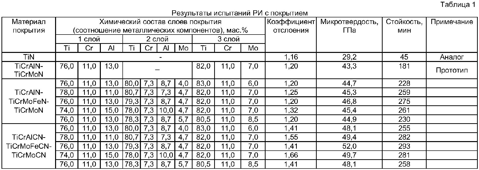 Способ получения многослойного покрытия для режущего инструмента, включающий вакуумно-плазменное нанесение многослойного покрытия, отличающийся тем, что наносят нижний слой из нитрида или карбонитрида соединения титана, хрома и алюминия при их соотношении, мас.%: титан 75,0-77,0, хром 10,4-11,5, алюминий 12,6-13,5; промежуточный – из нитрида или карбонитрида соединения титана, хрома, молибдена и алюминия при их соотношении, мас.%: титан 78,6-80,1, хром 6,9-7,6, молибден 4,6-4,8, алюминий 8,4-9,0; верхний – из нитрида или карбонитрида соединения титана, хрома и молибдена при их соотношении, мас.%: титан 81,5-82,7, хром 10,4-11,3, молибден 6,9-7,2, а нанесение покрытия осуществляют с использованием трех катодов, расположенных горизонтально в одной плоскости, первый из которых выполняют составным из титана и алюминия, второй выполняют составным из титана и молибдена и располагают противоположно первому, а третий изготавливают составным из титана и хрома и располагают между ними.
