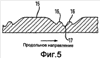 Если вид на фиг.3 рассматривать как вид выдавливающего рисунка на валике для тиснения согласно одному варианту осуществления настоящего изобретения, при этом выдавливающий рисунок развернут в плоскость, то промежутки между нитями 13 утка и нитями 12 основы, обозначенные позицией 14, не являются отверстиями, как в ткани, используемой при сквозной воздушной сушке, а представляют собой самую нижнюю плоскость выдавливающего рисунка, выполненного в сплошном материале. Кроме того, в этом случае части нитей 12 основы, которые образуют проступы 12а-12d в ткани 15, используемой при сквозной воздушной сушке, образуют линейные выступы, выстроенные в ряд по диагонали к продольному направлению, как это описано выше в отношении показанной на фиг.2 ткани, используемой при сквозной воздушной сушке. Части, в которых нити 12 основы пропущены под нитями 13 утка, образуют пропуски или углубления, хотя в данном случае части нитей 16 утка также видны на рельефе поверхности выдавливающего рисунка (см. фиг.5).