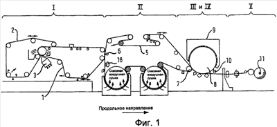 Между секцией формования I и секцией сквозной воздушной сушки II полотно тонкой бумаги переносится с внутренней формующей ткани 1 на ткань 5, используемую при сквозной воздушной сушке. Этот перенос достигается сопряжением обеих тканей 1 и 5 в определенном месте. Для переноса полотна с внутренней формующей ткани 1 на ткань 5, используемую при сквозной воздушной сушке, применяют вакуумный ящик или съемный валик 6. В ходе этого процесса полотно подвергается дополнительному обезвоживанию. Благодаря действию вакуумного ящика 6, расположенного перед по ходу цилиндрами для сквозной воздушной сушки, полотно тонкой бумаги и его волокна могут всасываться в пропуски, образованные между проступами ткани 5 для сквозной воздушной сушки.