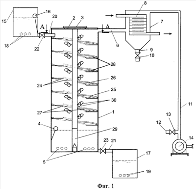 При работе низкотемпературного вакуум-котла разогретый обводненный битум из котла перекачивается в верхнюю часть испарительной камеры, где он, стекая по Z-образному лотку, обезвоживается и сливается обратно в котел. Причем в испарительной камере и котле создается вакуумирование.