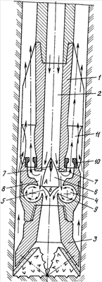 Эжекционный узел 11 способствует созданию депрессии, снижению дифференциального давления на забой. Забой скважины одновременно подвергается депрессионному и гидроакустическому воздействиям. При этом на забое скважины создаются механоактивационные процессы с проявлением гидродинамической и гидроакустической кавитации.