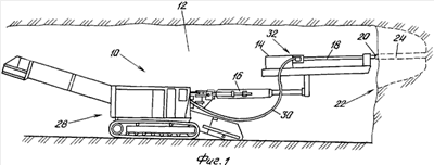 Буровая машина имеет кабину или платформу 28 оператора. Линия 30 подачи патрона проходит от подходящего места на платформе для приемника 32 для патрона, прикрепленного к перфоратору 14.