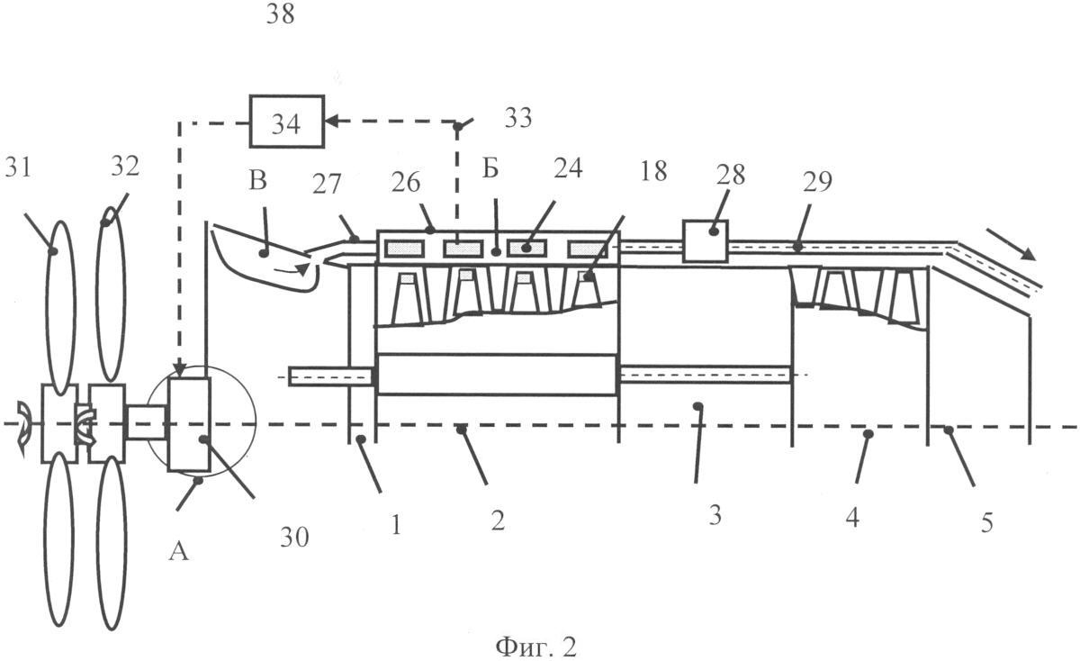 При останове турбовинтового газотурбинного двигателя все операции осуществляются в обратной последовательности. Так как роторы биротативного электродвигателя 30 имеют рабочие обороты, в несколько раз меньшие, чем вал турбогенератора 7, то отпадает необходимость в применении тяжелого и дорогостоящего редуктора, который применяется, например, на двигателе НК 12 MB. Воздушные винты 31 и 32 вращаются в противоположные стороны с одинаковыми частотами вращения.