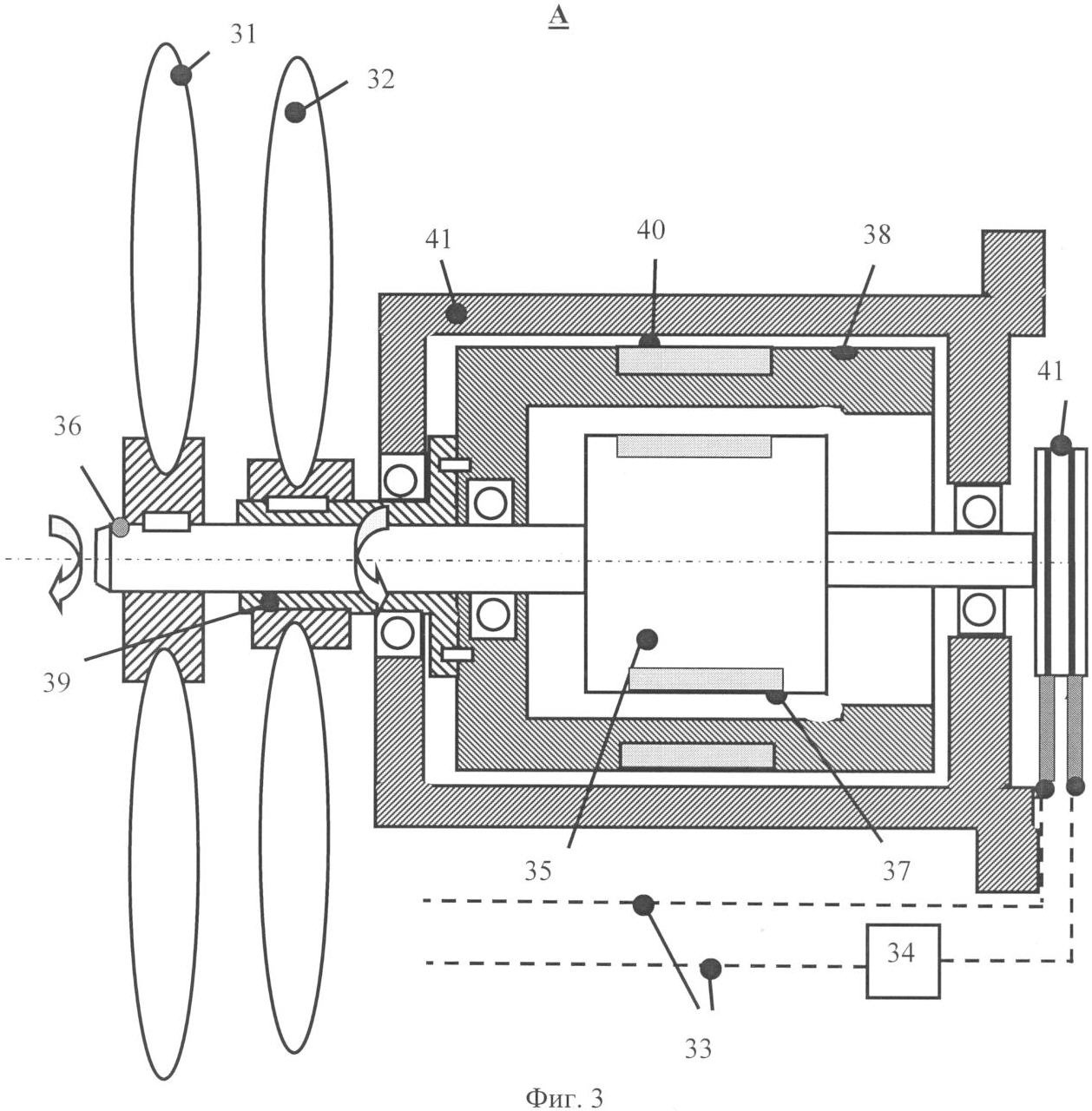 Биротативный электродвигатель 30 (фиг.3), содержащий внутренний ротор 35 с внутренним валом 36 и постоянными магнитами 37, внешний ротор 38 с внешним валом 39, с обмотками 40 и статор 41. Для подвода электроэнергии служит коллектор 41.