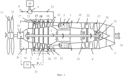 на фиг.1 приведена схема турбовинтового газотурбинного двигателя,