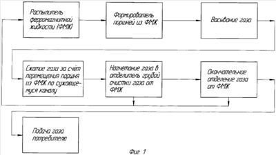 Сущность предложенного изобретения состоит в том, что для сжатия газа используется поршень в виде пленки из ферромагнитной жидкости (ФМЖ), который, перемещаясь по каналу, имеющему переменное (сужающееся к стороне нагнетания) сечение, под действием электромагнитных сил сжимает и разгоняет газ, затем газ, попадая вместе с поршнем в разделитель, отделяется от ФМЖ и, пройдя конечный очиститель, поступает к потребителю, а ФМЖ направляется в начало цикла.