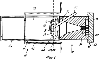На фиг.1 показан разрез форсунки согласно изобретению. Предложенная согласно изобретению форсунка 10 имеет сопло 12, которое жестко соединено с теплозащитным щитком 24. Теплозащитный щиток 24 определяет вместе с трубой 40 камеры сгорания, соединенной с теплозащитным щитком 24, камеру 22 сгорания. Труба 40 камеры сгорания окружена наружной трубой 42, которая образует фланец форсунки. К этой наружной трубе 42 прикреплена жаровая труба 38. Соединения между теплозащитным щитком 24 и трубой 40 камеры сгорания или между трубой 40 камеры сгорания, наружной трубой 42 и жаровой трубой 38 представляют собой, в общем, сварные соединения. На топливном сопле 12 расположен подвод 50 топлива, который имеет металлическую трубу 52 для подачи топлива, а также иглу 14 форсунки для вспрыскивания топлива в камеру 22 сгорания. Далее, в области 16 топливного сопла предусмотрены каналы для подвода в топливное сопло 12 первичного воздуха для горения, который проходит мимо топливной иглы 14, чтобы потом направиться по радиально расширяющемуся воздухопроводу топливного сопла 12 в направлении камеры сгорания и, наконец, в саму камеру 22 сгорания. С помощью радиального расширения воздухопровода благодаря эффекту Вентури достигается улучшенное распыление. Внутри камеры 22 сгорания далее расположен отражательный диск 36, который предпочтительно имеет выпуклость. Эта выпуклость в направлении зоны выгорания препятствует внезапным изменениям, обусловленным жаром, формы отражательного диска 36. Благодаря выпуклости отражательного диска 36 в направлении зоны 32 выгорания, кроме того, появляется достаточное пространство для размещения пусковой камеры 18. Стенка, определяющая пусковую камеру 18, приварена к отражательному диску 36.