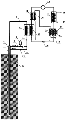 В теплообменнике 4 осуществляется конденсация паров рабочего тела, поступающих по паровому трубопроводу 3 из опускной трубы 2. Сконденсированные пары рабочего тела из теплообменника 4 через запорный клапан 8 самотеком поступают в опускную трубу 2, по которой стекают вниз. Протекая по опускной трубе, жидкое рабочее тело под действием тепловой энергии, поступающей из грунтового массива 20, испаряется. Образовавшиеся пары перемещаются в верхнюю зону опускной трубы 2 и по паровому трубопроводу 3 возвращаются в теплообменник 4.