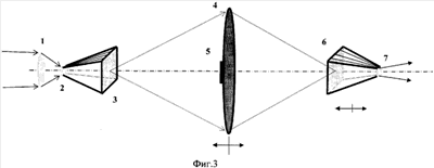 2 и 3 – соответственно меньший и больший торцы первого ВОП; 4 – фокусирующая и диспергирующая линза (ФДЛ);