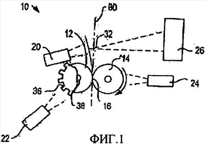 Теоретическая центральная линия 30 проходит наружу от зоны контакта, перпендикулярно вальцам 12 и 14. Два стандартных лазерных датчика 26 и 28 установлены параллельно в по существу вертикальной плоскости на таком расстоянии от зоны контакта, чтобы параллельные лазерные лучи, выходящие из двух датчиков, пересекали центральную линию 30 в точках 32. Точки 32 предпочтительно должны быть расположены в непосредственной близости к зоне контакта, чтобы скручивание бумаги можно было измерить сразу же после того, как бумага выйдет из зоны контакта. В настоящем варианте осуществления расстояние между зоной контакта и точками 32 составляет приблизительно 37 мм. Точное расстояние может отличаться от этого на несколько мм. Однако если точки 32 будут расположены слишком близко к зоне контакта, лазерные датчики не смогут регистрировать скручивание.